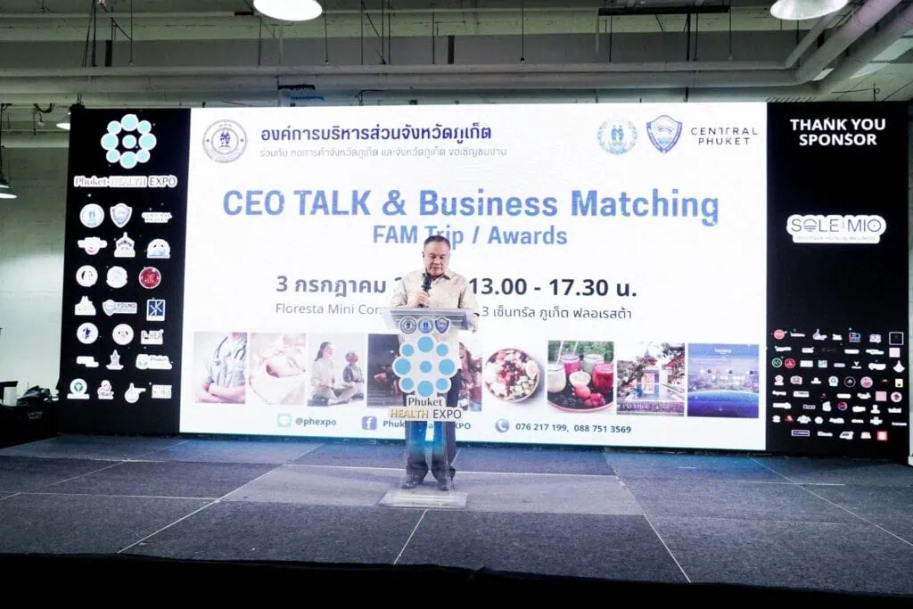 July 3, 2025, Dr. Pimpakan Tantithamwong joined the CEO TALK & Business Matching FAM Trip / Awards seminar at the “Phuket Health Expo 2025”, chaired by Mr. Rewat Areerob, President of the Phuket Provincial Administrative Organization, and Mr. Kongsak Khupongsakorn, President of the Phuket Chamber of Commerce, gave a welcome speech to attendees at the Mini Convention Hall, Central Festival Phuket.